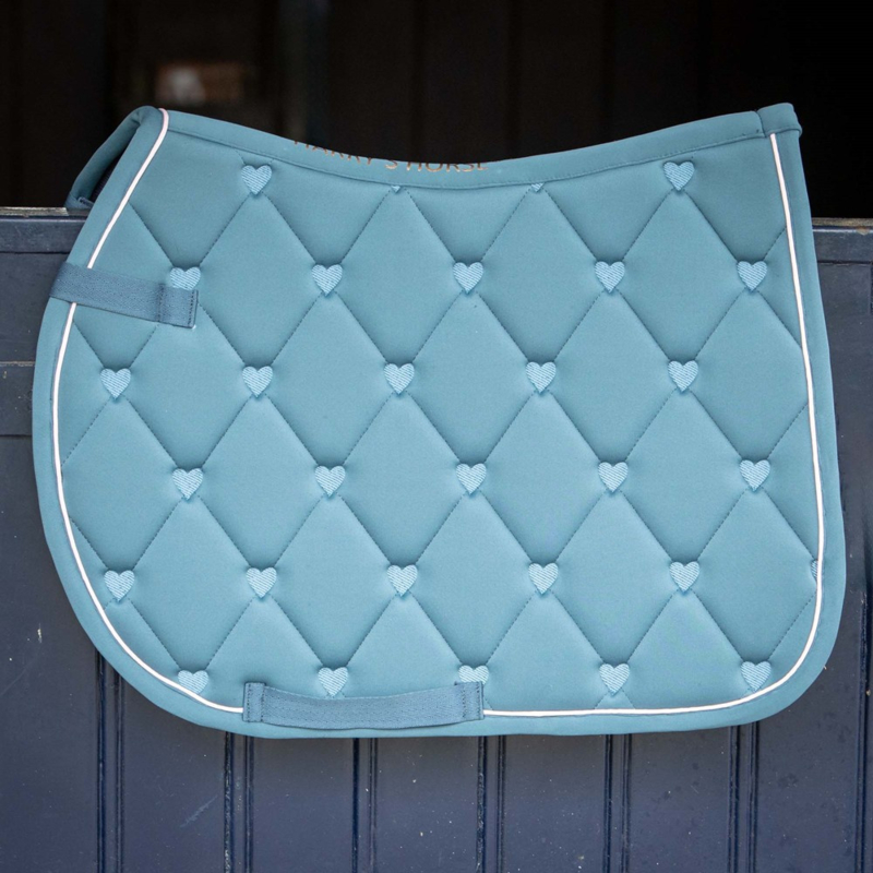 Zadeldek met hartvormige allover quilt en een roze piping rondom, coolmesh voering, singel- en zadellussen.Materiaal: 94% Polyester, 6% Elastane.