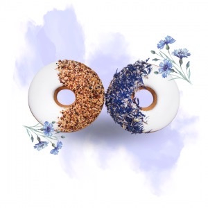 Twee handgemaakte donuts met roze korenbloem – natuurlijke, kleurrijke en rustgevende paardenkoekjes.€ 7,00